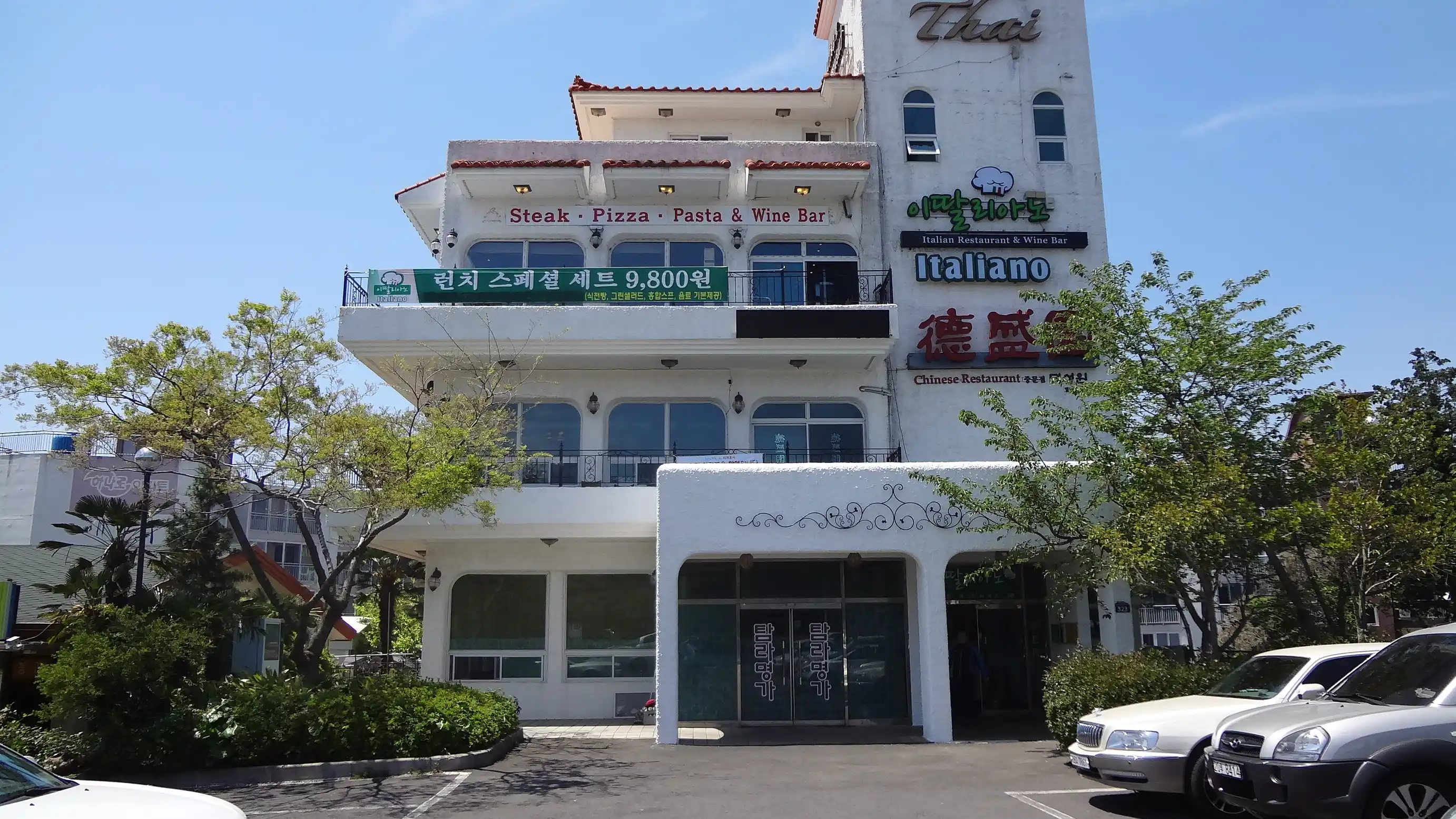 둘째 날 숙소에서 바라본 모습과 점심 식사를 한 식당입니다.