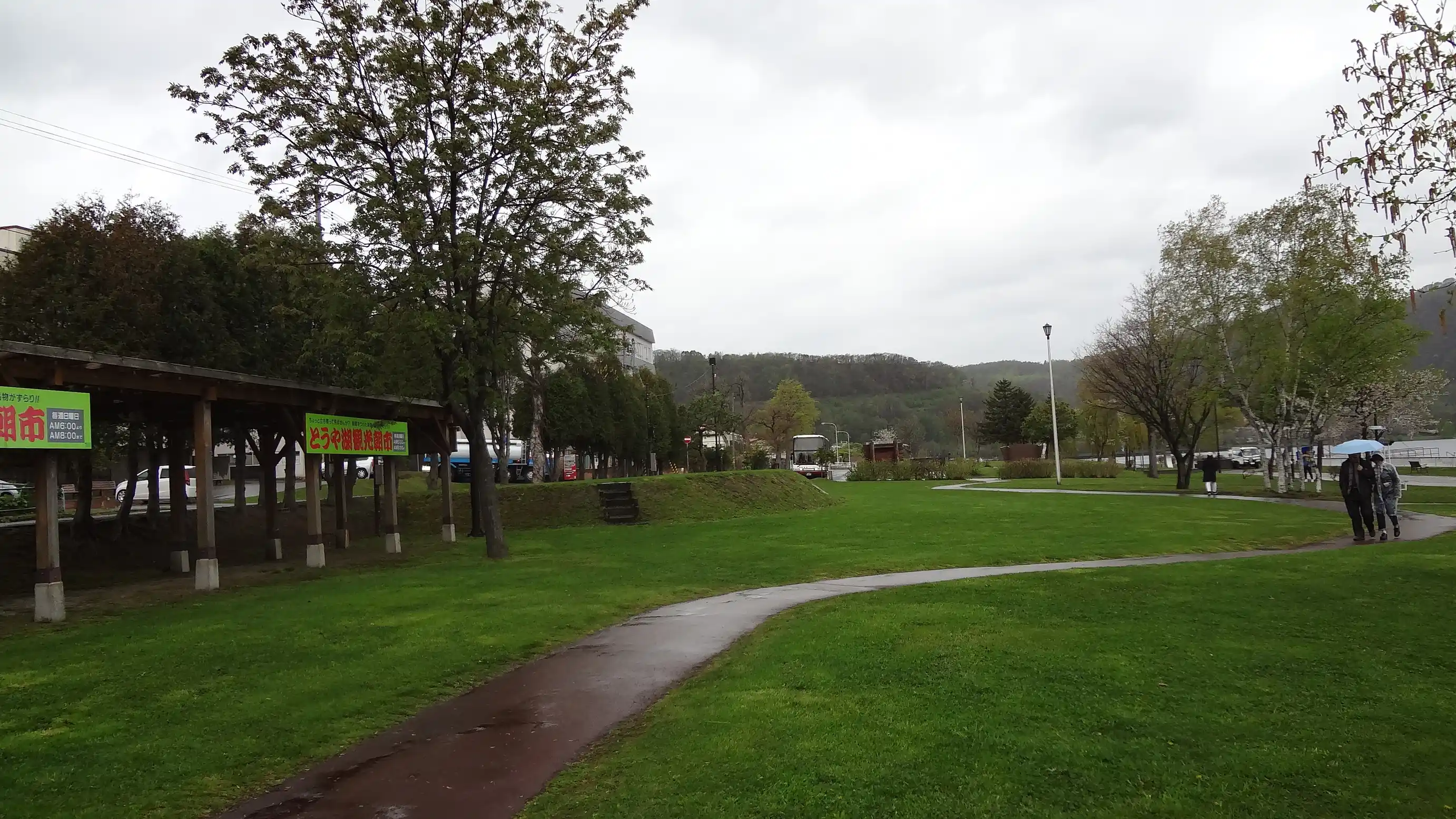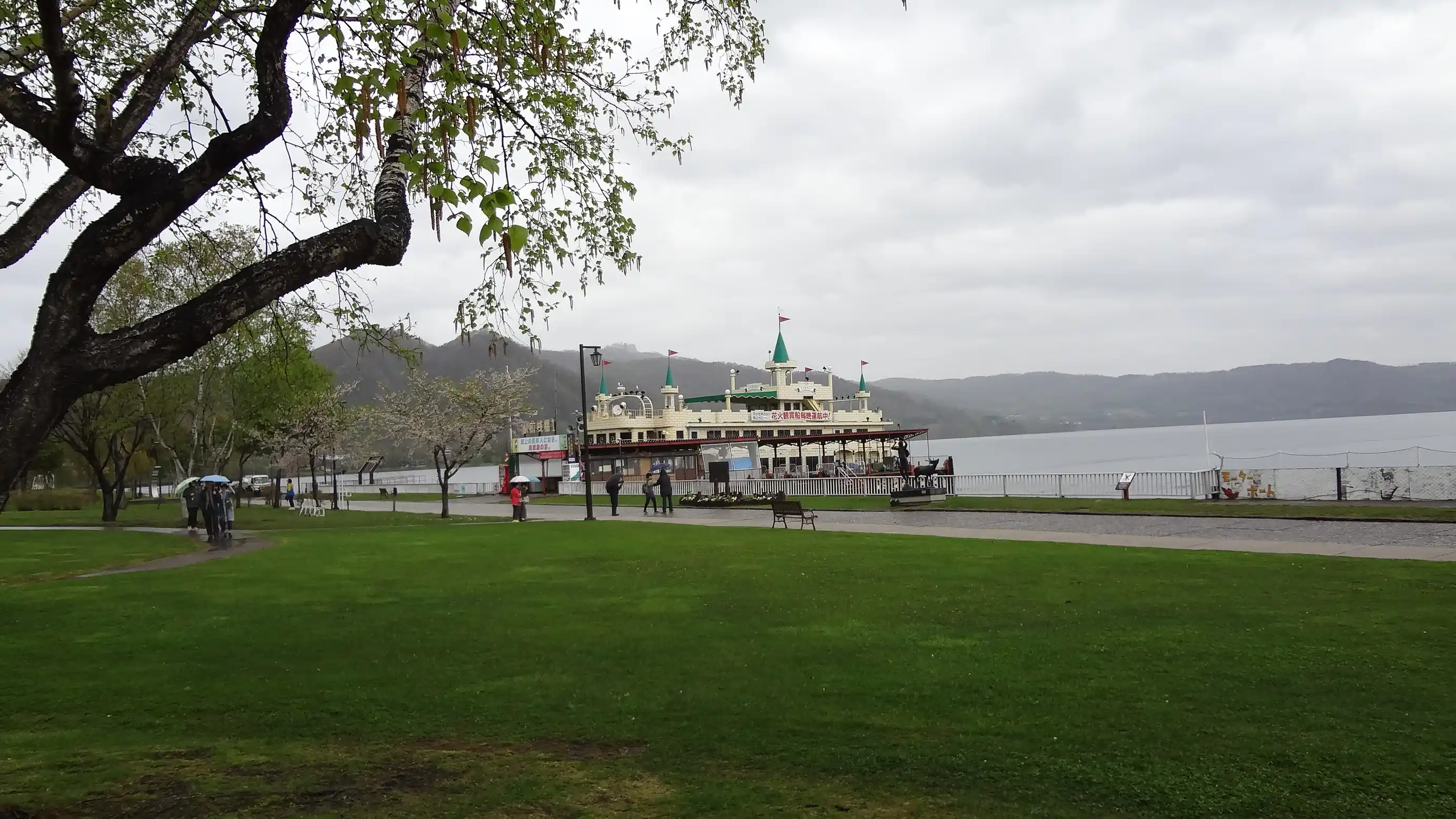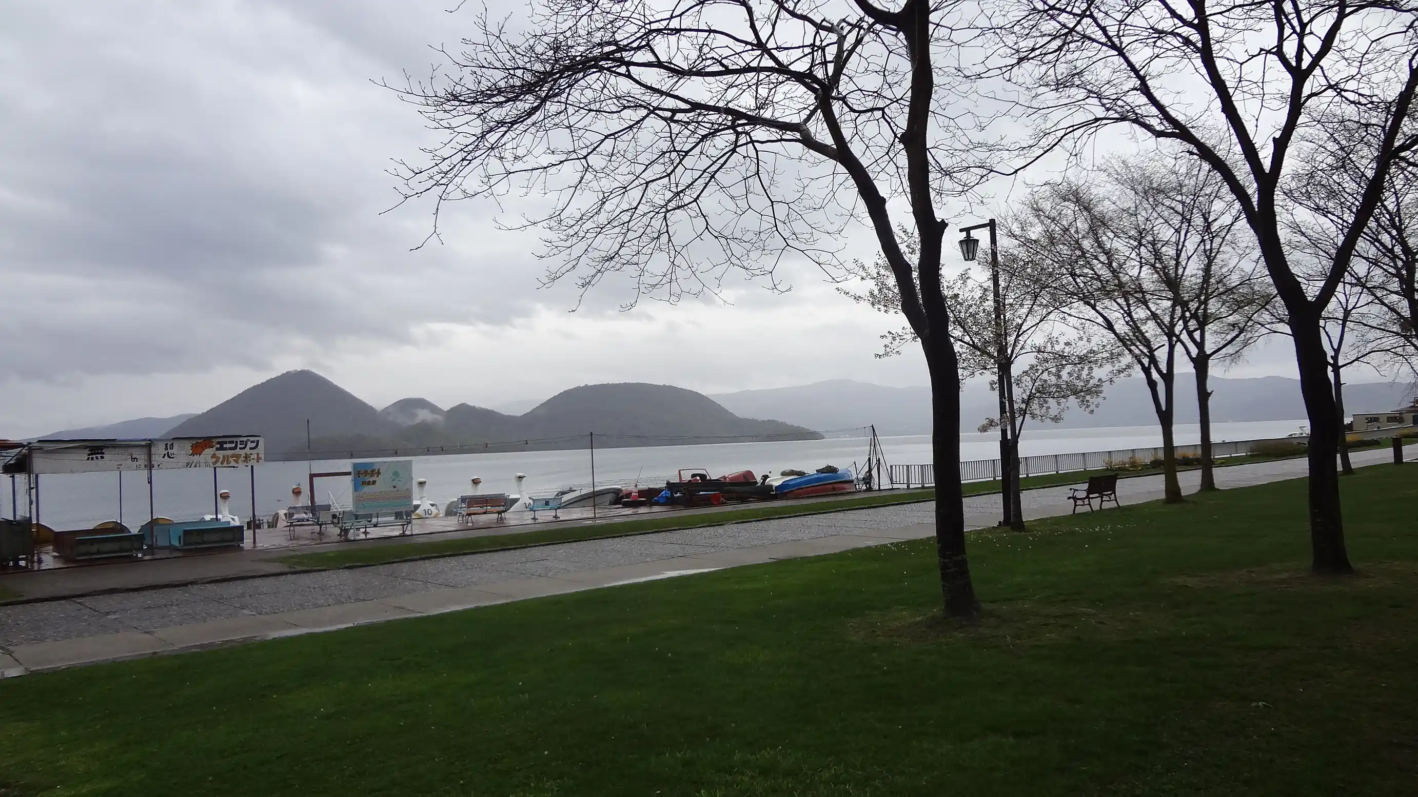 This is in front of the Toya Lake cruise ship pier. The weather was bad, but that gave it a nice atmosphere.
