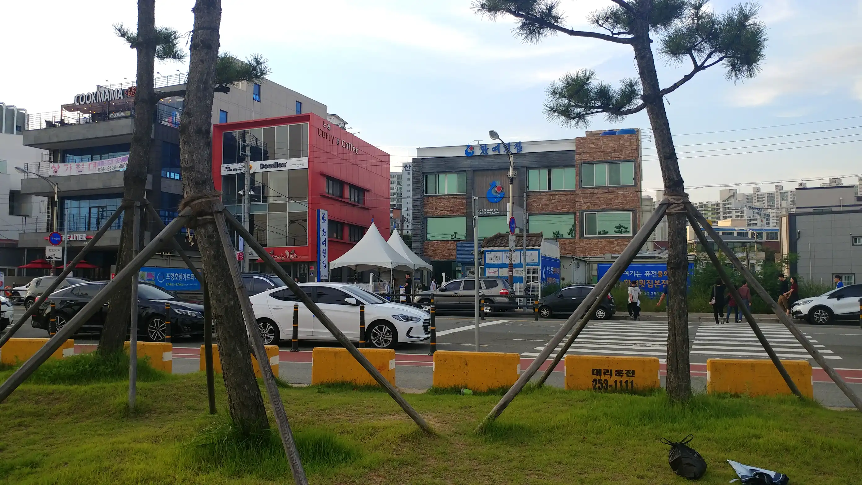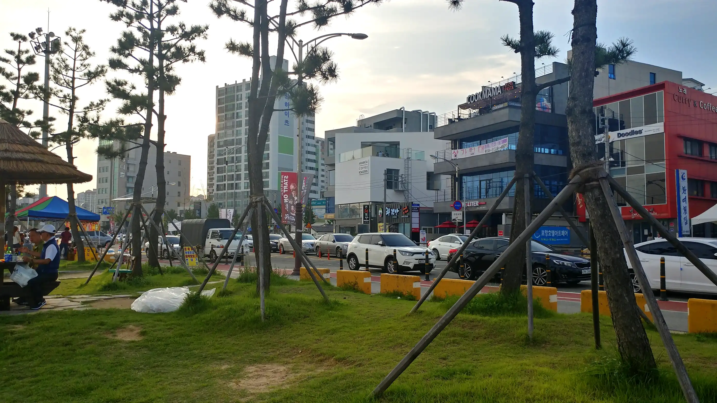 해안도로를 따라 계속 남쪽으로 내려가다가 포항의 바닷가에 들렀습니다. 연휴라 그런지 사람들이 많았습니다. 한 횟집에 들러서 저녁으로 물회를 먹었습니다. 맛있었습니다. 식사 후에 근처 바닷가를 걸었습니다. 영일루라고 하는 바다 위에 있는 누각에도 들렀습니다. 해변, 건물, 공장 시설이 어우러져 경치가 좋았습니다.