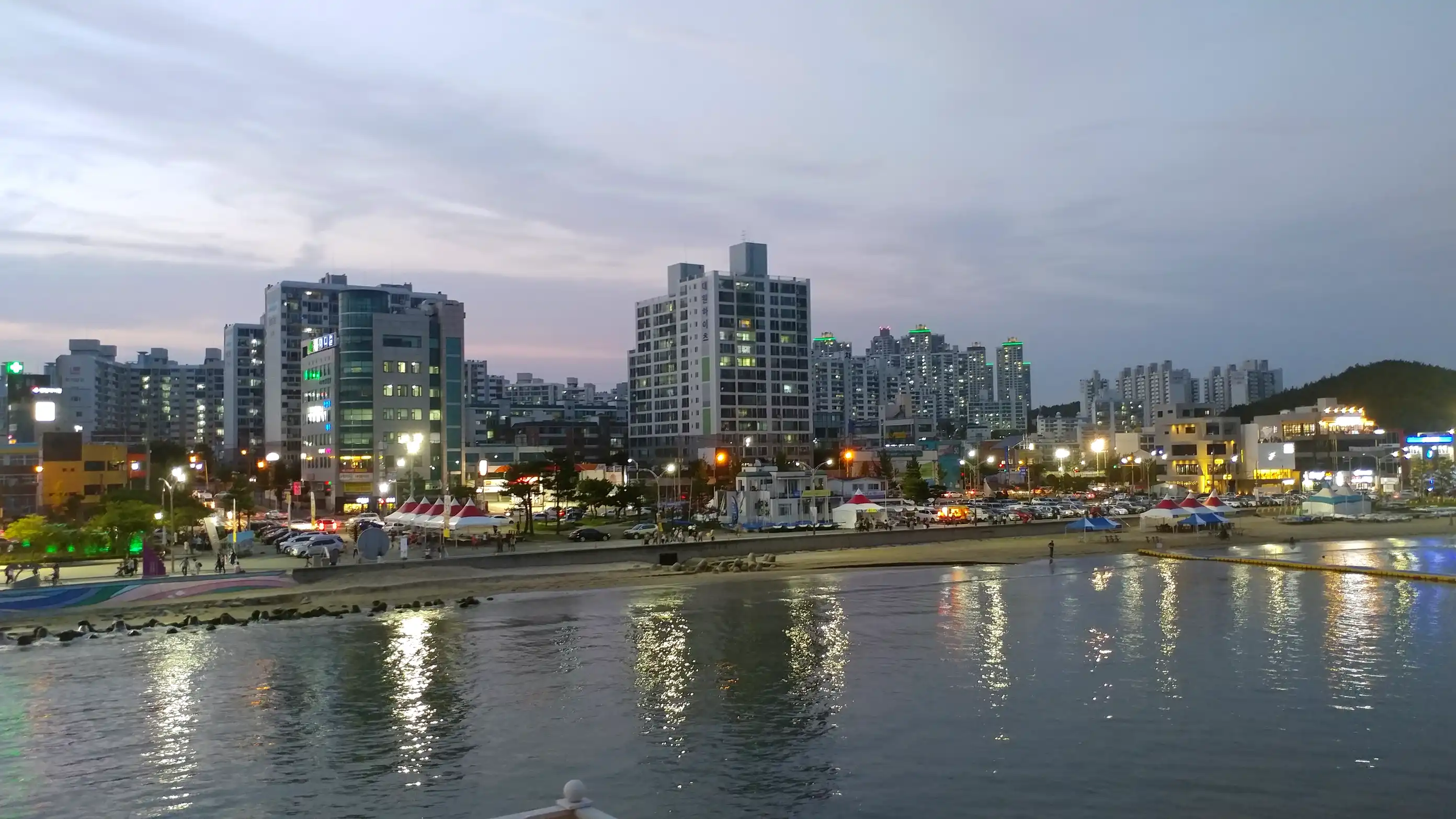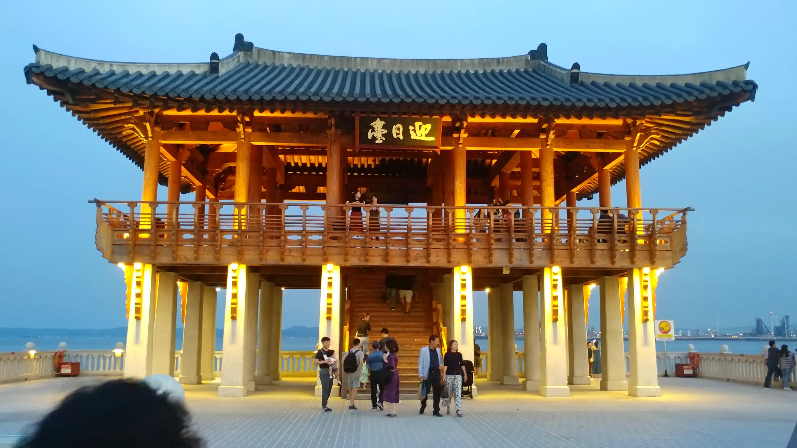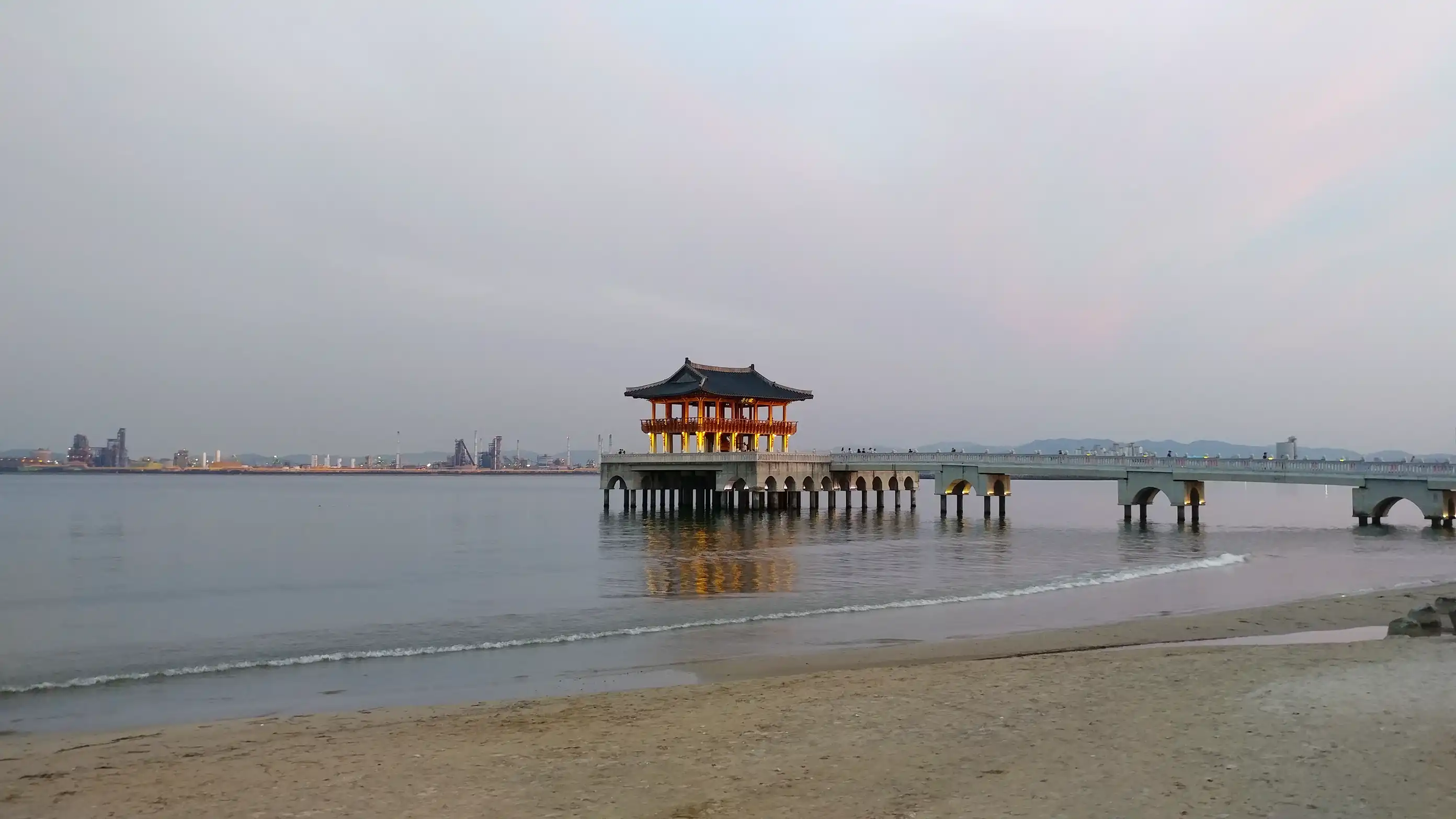 We continued south along the coastal road and stopped by the seaside in Pohang. There were many people because it was a holiday. We stopped at a raw fish restaurant and had mulhoe for dinner. It was delicious. After the meal, we walked along the nearby seaside. We also visited Yeongilru, a pavilion over the sea. The scenery was nice with the beach, buildings, and factory facilities blended together.