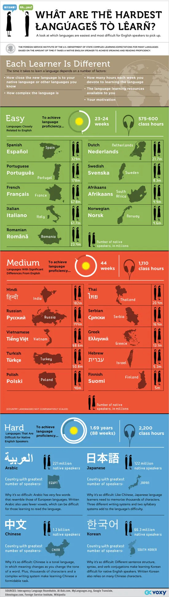 첨부된 이미지들은 영어 원어민들을 대상으로 조사한 언어별 학습 난이도입니다. 신뢰할만한 조사인지는 모르겠지만 재미있는 결과입니다. 예를 들어 일본어의 경우 영어 원어민에게는 어려운 언어이지만 한국인에게는 쉬운 외국어로 평가됩니다. 한국어와 일본어는 문장구조가 동일합니다. 한국어와 영어는 문장구조가 완전히 다릅니다. 영어는 한국인에게 어려운 언어입니다. 영어와 한국어는 이렇게나 멀리 떨어져 있습니다.